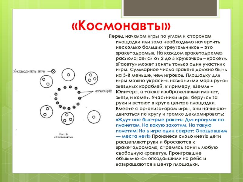 начертить несколько больших треугольников – это «ракетодромы». На каждом «ракетодроме» располагается от 2 до 5 кружочков – «ракет». «Ракету» может занять только один участник игры. Суммарное число «ракет» должно быть на 3-8 меньше, чем игроков. Площадку для игры можно украсить названиями маршрутов звездных кораблей, к примеру, «Земля – Юпитер», а также изображениями планет, звезд и комет. Участники игры берутся за руки и встают в круг в центре площадки. Вместе с организатором игры, они начинают двигаться по кругу и громко декламировать: «Ждут нас быстрые ракеты Для прогулок по планетам. На какую захотим, На такую полетим! Но в игре один секрет: Опоздавшим — места нет!» Произнеся слово «нет!» дети расцепляют руки и бросаются к «ракетодромам», стремясь занять любую свободную «ракету». Проигравшие объявляются опоздавшими на рейс и возвращаются в центр площадки.