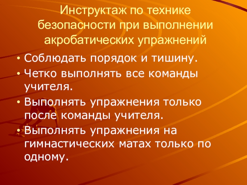 Инструктаж по технике безопасности при выполнении акробатических упражненийСоблюдать порядок и тишину.Четко выполнять все команды учителя.Выполнять упражнения только после команды учителя.Выполнять упражнения на гимнастических матах только по одному.