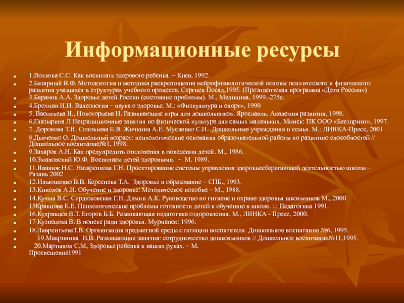 20.Мартынов С,М, Здоровье ребенка в наших руках. – М. Просвещение1991