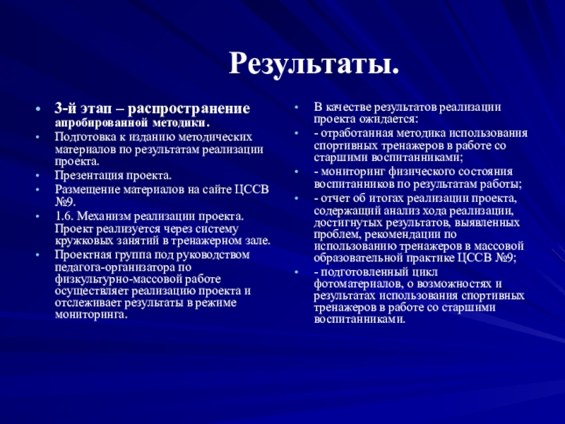 - отчет об итогах реализации проекта, содержащий анализ хода реализации, достигнутых результатов, выявленных проблем, рекомендации по использованию тренажеров в массовой образовательной практике ЦССВ №9;