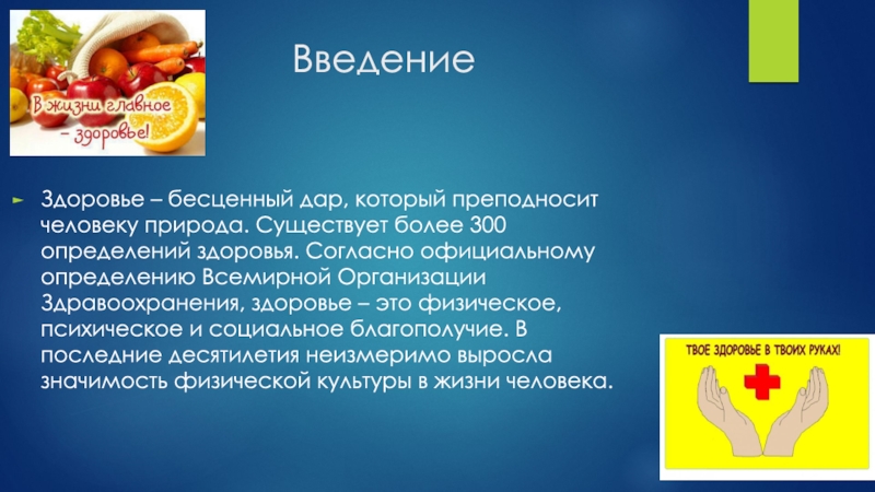определений здоровья. Согласно официальному определению Всемирной Организации Здравоохранения, здоровье – это физическое, психическое и социальное благополучие. В последние десятилетия неизмеримо выросла значимость физической культуры в жизни человека.