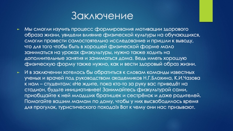 И в заключении хотелось бы обратиться к словам команды известных ученых и врачей под руководством академиков Н.Г.Блохина, К.И.Чазова к нам – студентам: «Не ждите, пока кто-то за руку вас приведёт на стадион, будьте инициативнее! Занимайтесь физкультурой сами, приобщайте к ней младших братишек и сестрёнок и даже родителей. Помогайте вашим мамам по дому, чтобы у них высвободилось время для прогулок, туристического похода!» Вот к чему они нас призывают.