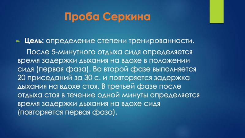 дыхания на вдохе в положении сидя (первая фаза). Во второй фазе выполняется 20 приседаний за 30 с. и повторяется задержка дыхания на вдохе стоя. В третьей фазе после отдыха стоя в течение одной минуты определяется время задержки дыхания на вдохе сидя (повторяется первая фаза).