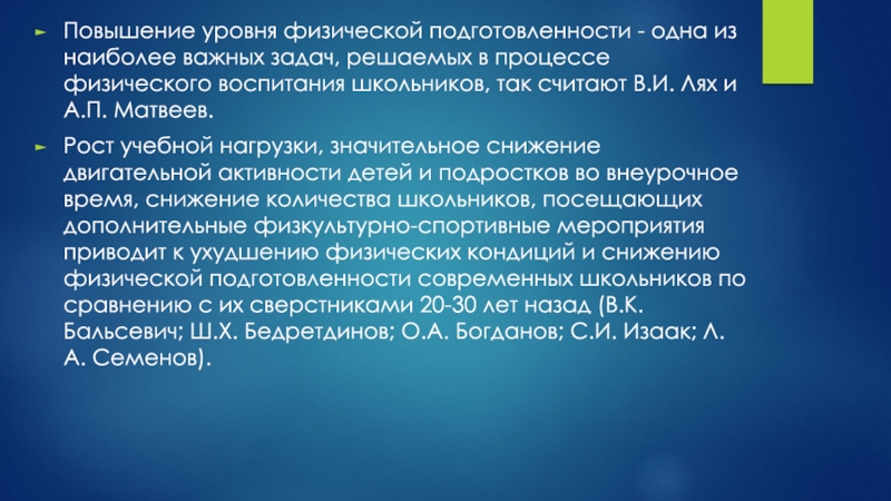 Рост учебной нагрузки, значительное снижение двигательной активности детей и подростков во внеурочное время, снижение количества школьников, посещающих дополнительные физкультурно-спортивные мероприятия приводит к ухудшению физических кондиций и снижению физической подготовленности современных школьников по сравнению с их сверстниками 20-30 лет назад (В.К. Бальсевич; Ш.Х. Бедретдинов; O.A. Богданов; С.И. Изаак; Л.А. Семенов).