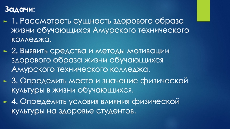 Слайд 4Цель работы: изучить влияние физической культуры на учащихся Амурского технического колледжа,