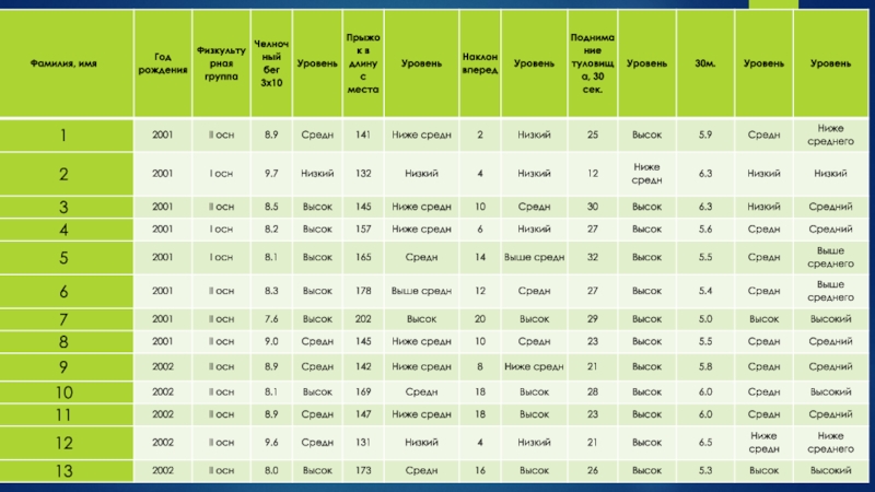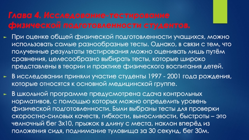 Слайд 13Глава 4. Исследование-тестирование физической подготовленности студентов.