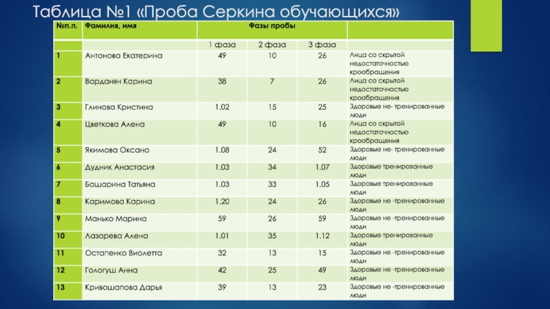 Слайд 17Таблица №1 «Проба Серкина обучающихся»