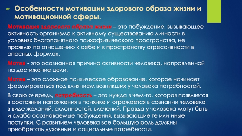 Слайд 9Особенности мотивации здорового образа жизни и мотивационной сферы.