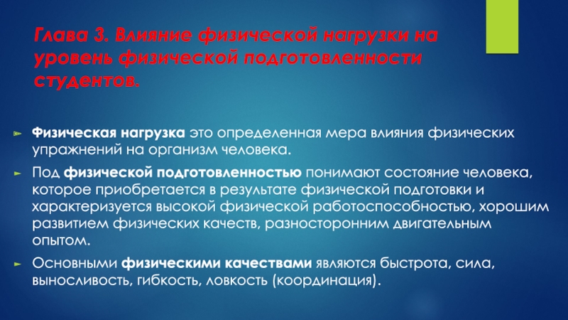 Слайд 12Глава 3. Влияние физической нагрузки на уровень физической подготовленности студентов.