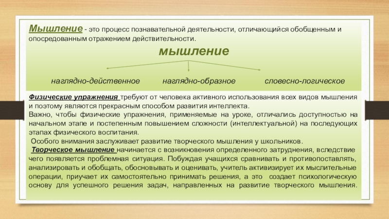 Физические упражнения требуют от человека активного использования всех видов мышления и поэтому являются прекрасным способом развития интеллекта.