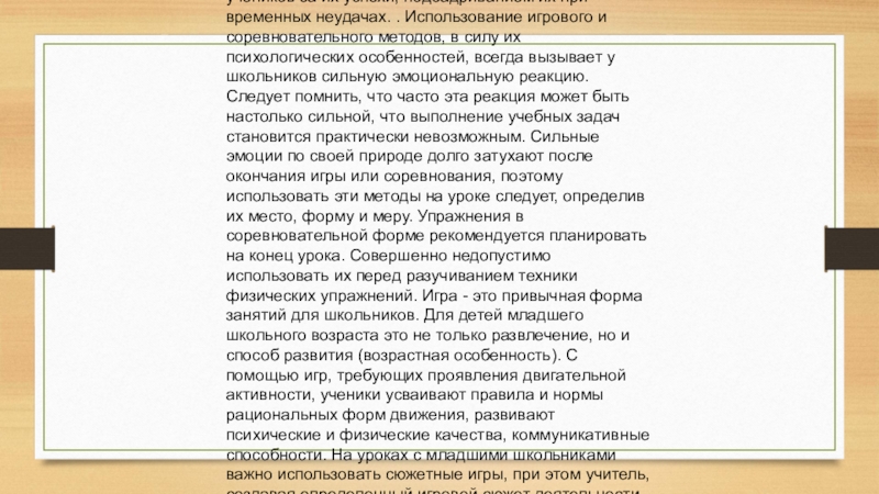 иногда превращая все дело в шутку. Урок физической культуры всегда приносит удовлетворение и радость, если школьники двигаются, а не сидят, скучая на скамейках, если они видят учителя в хорошем настроении, понимают его шутки, знают и наглядно ощущают результаты своего труда. Излишняя возбужденность учителя (суетливость, шумливость), как правило, приводит к повышению неорганизованной активности учеников. Не следует смешить и развлекать школьников, бесконечно шутить с ними. Важно, чтобы строгость, точность и четкость действий учителя перемежались улыбками, словами поощрения учеников за их успехи, подбадриванием их при временных неудачах. . Использование игрового и соревновательного методов, в силу их психологических особенностей, всегда вызывает у школьников сильную эмоциональную реакцию. Следует помнить, что часто эта реакция может быть настолько сильной, что выполнение учебных задач становится практически невозможным. Сильные эмоции по своей природе долго затухают после окончания игры или соревнования, поэтому использовать эти методы на уроке следует, определив их место, форму и меру. Упражнения в соревновательной форме рекомендуется планировать на конец урока. Совершенно недопустимо использовать их перед разучиванием техники физических упражнений. Игра - это привычная форма занятий для школьников. Для детей младшего школьного возраста это не только развлечение, но и способ развития (возрастная особенность). С помощью игр, требующих проявления двигательной активности, ученики усваивают правила и нормы рациональных форм движения, развивают психические и физические качества, коммуникативные способности. На уроках с младшими школьниками важно использовать сюжетные игры, при этом учитель, создавая определенный игровой сюжет деятельности для учеников, включает в содержание урока программный учебный материал. Применяя такой метод, учитель сам должен стать участником игры, поверить в реальность создаваемых им образов и выполнять соответствующую сюжету роль. С повышением возраста школьников следует использовать игры, отличающиеся все большей реалистичностью. Это могут быть разнообразные спортивные игры, вначале с упрощенными правилами и условиями выполнения, затем полностью соответствующие реальным требованиям.