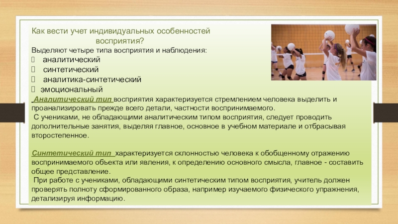 При работе с учениками, обладающими синтетическим типом восприятия, учитель должен проверять полноту сформированного образа, например изучаемого физического упражнения, детализируя информацию.