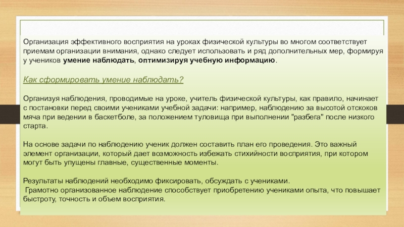 Слайд 12Организация эффективного восприятия на уроках физической культуры во многом соответствует приемам