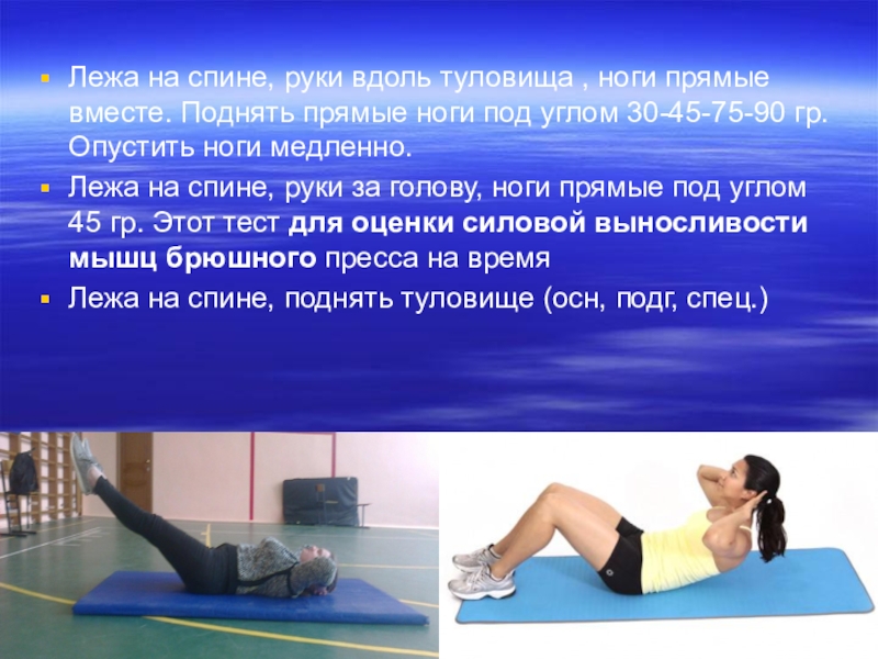 Лежа на спине, руки за голову, ноги прямые под углом 45 гр. Этот тест для оценки силовой выносливости мышц брюшного пресса на время