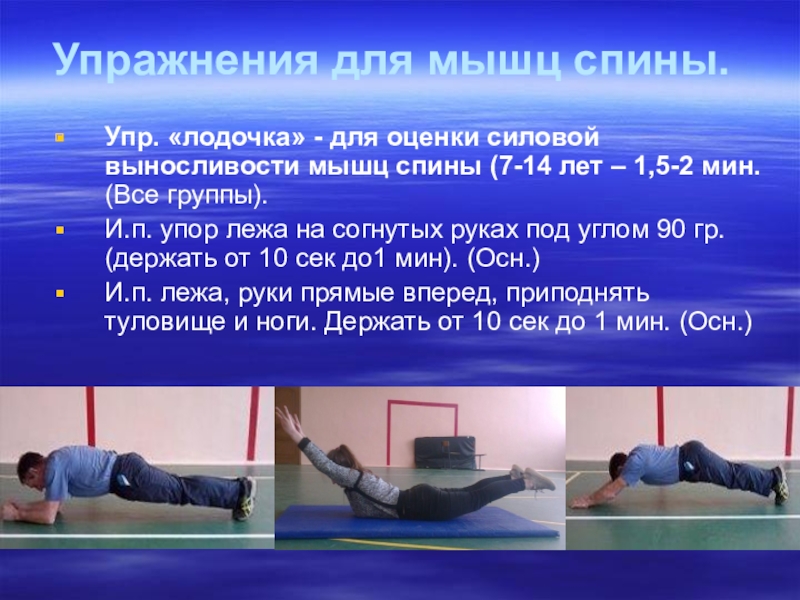 Упр. «лодочка» - для оценки силовой выносливости мышц