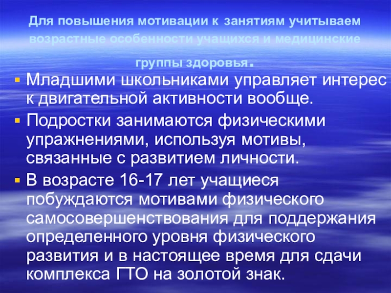 Слайд 3Для повышения мотивации к занятиям учитываем возрастные особенности учащихся и медицинские