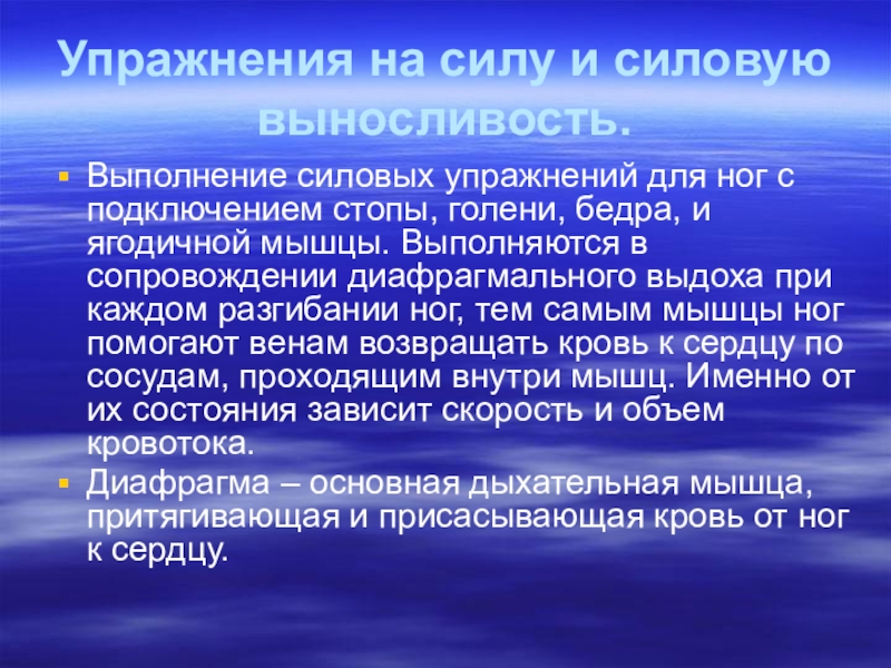 подключением стопы, голени, бедра, и ягодичной мышцы. Выполняются в сопровождении диафрагмального выдоха при каждом разгибании ног, тем самым мышцы ног помогают венам возвращать кровь к сердцу по сосудам, проходящим внутри мышц. Именно от их состояния зависит скорость и объем кровотока.