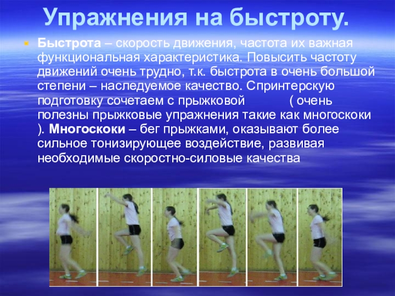 Повысить частоту движений очень трудно, т.к. быстрота в очень большой степени – наследуемое качество. Спринтерскую подготовку сочетаем с прыжковой ( очень полезны прыжковые упражнения такие как многоскоки ). Многоскоки – бег прыжками, оказывают более сильное тонизирующее воздействие, развивая необходимые скоростно-силовые качества