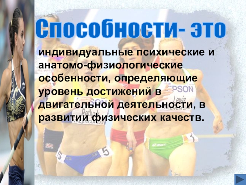 индивидуальные психические и анатомо-физиологические особенности, определяющие уровень достижений в двигательной деятельности, в развитии физических качеств.