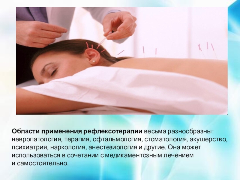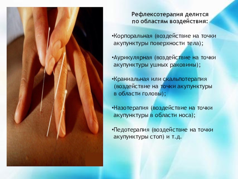 Слайд 2Рефлексотерапия — это методы физического воздействия на точечные участки поверхности тела (точки акупунктуры).