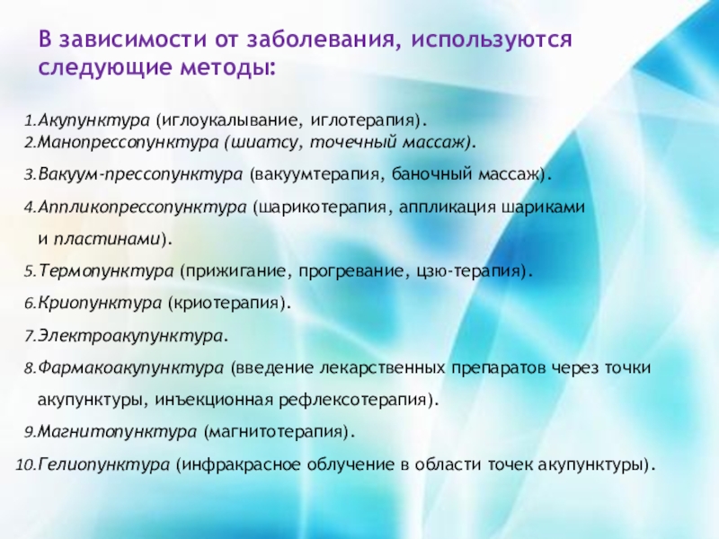 Слайд 5В зависимости от заболевания, используются следующие методы: