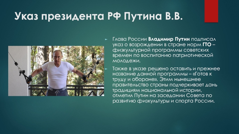 возрождении в стране норм ГТО – физкультурной программы советских времен по воспитанию патриотической молодежи.