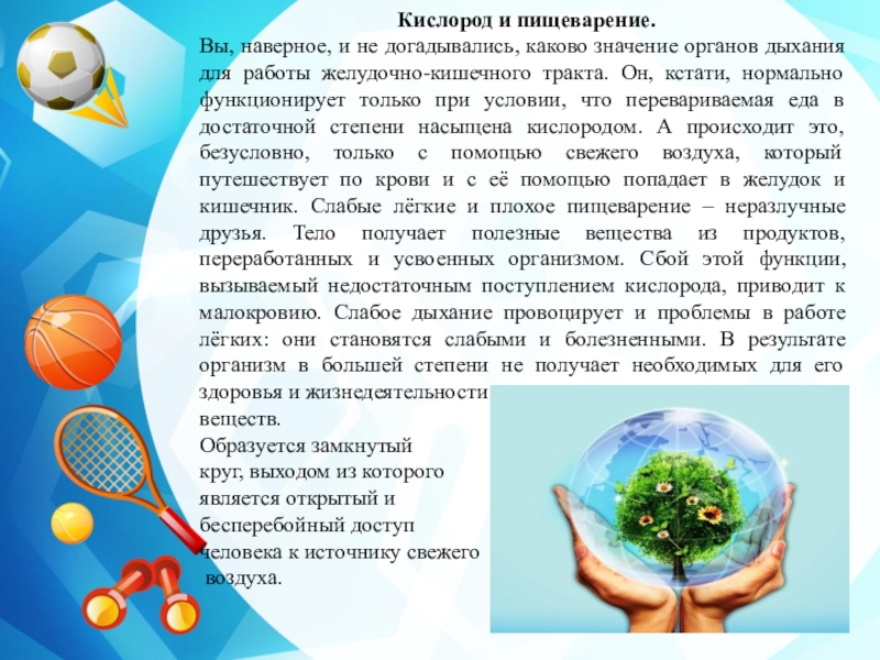 дыхания для работы желудочно-кишечного тракта. Он, кстати, нормально функционирует только при условии, что перевариваемая еда в достаточной степени насыщена кислородом. А происходит это, безусловно, только с помощью свежего воздуха, который путешествует по крови и с её помощью попадает в желудок и кишечник. Слабые лёгкие и плохое пищеварение – неразлучные друзья. Тело получает полезные вещества из продуктов, переработанных и усвоенных организмом. Сбой этой функции, вызываемый недостаточным поступлением кислорода, приводит к малокровию. Слабое дыхание провоцирует и проблемы в работе лёгких: они становятся слабыми и болезненными. В результате организм в большей степени не получает необходимых для его здоровья и жизнедеятельности