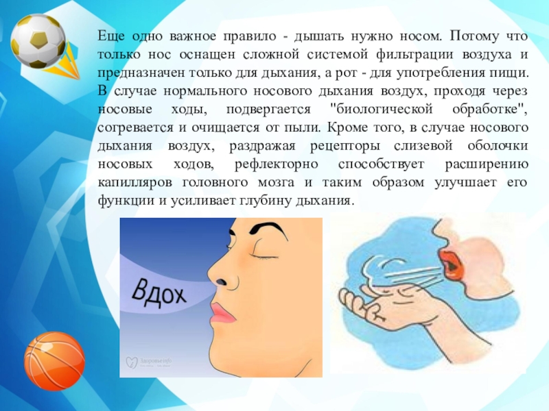 Слайд 12Еще одно важное правило - дышать нужно носом. Потому что только