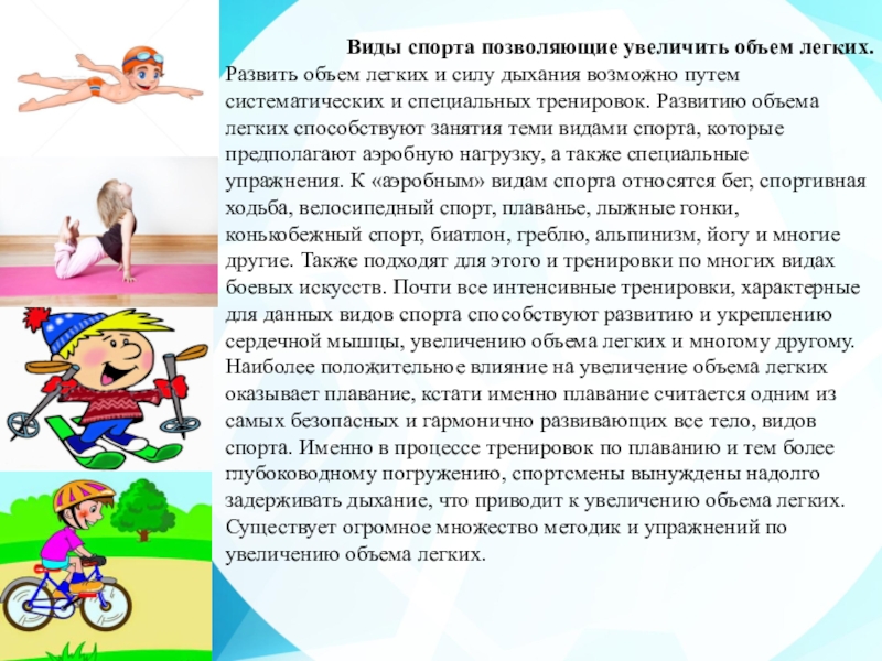 силу дыхания возможно путем систематических и специальных тренировок. Развитию объема легких способствуют занятия теми видами спорта, которые предполагают аэробную нагрузку, а также специальные упражнения. К «аэробным» видам спорта относятся бег, спортивная ходьба, велосипедный спорт, плаванье, лыжные гонки, конькобежный спорт, биатлон, греблю, альпинизм, йогу и многие другие. Также подходят для этого и тренировки по многих видах боевых искусств. Почти все интенсивные тренировки, характерные для данных видов спорта способствуют развитию и укреплению сердечной мышцы, увеличению объема легких и многому другому. Наиболее положительное влияние на увеличение объема легких оказывает плавание, кстати именно плавание считается одним из самых безопасных и гармонично развивающих все тело, видов спорта. Именно в процессе тренировок по плаванию и тем более глубоководному погружению, спортсмены вынуждены надолго задерживать дыхание, что приводит к увеличению объема легких. Существует огромное множество методик и упражнений по увеличению объема легких.