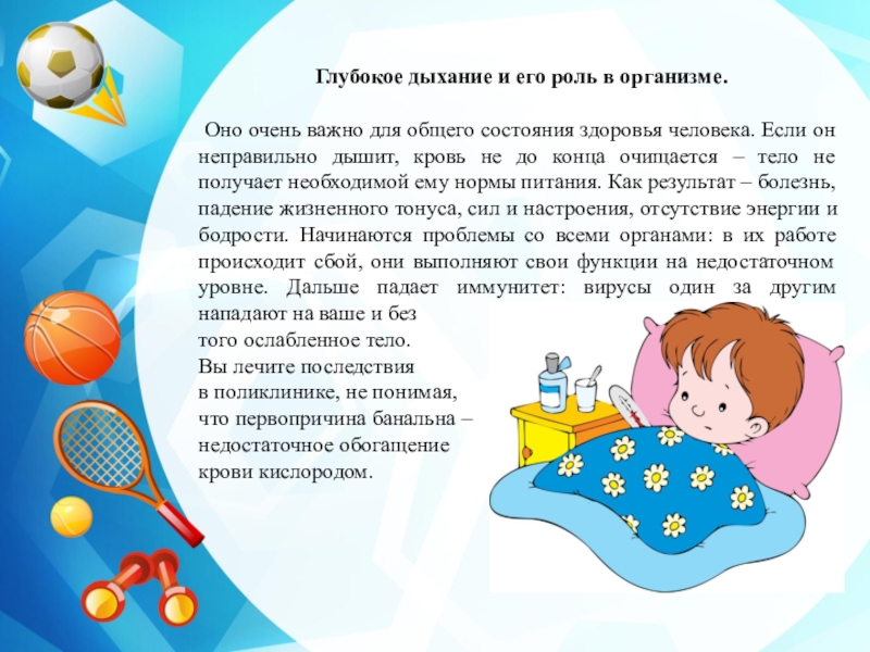для общего состояния здоровья человека. Если он неправильно дышит, кровь не до конца очищается – тело не получает необходимой ему нормы питания. Как результат – болезнь, падение жизненного тонуса, сил и настроения, отсутствие энергии и бодрости. Начинаются проблемы со всеми органами: в их работе происходит сбой, они выполняют свои функции на недостаточном уровне. Дальше падает иммунитет: вирусы один за другим нападают на ваше и без