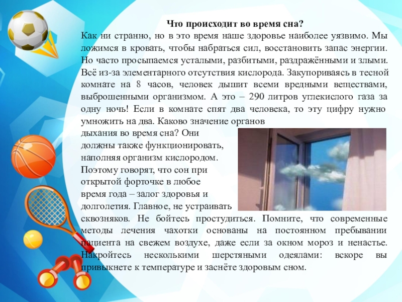 время наше здоровье наиболее уязвимо. Мы ложимся в кровать, чтобы набраться сил, восстановить запас энергии. Но часто просыпаемся усталыми, разбитыми, раздражёнными и злыми. Всё из-за элементарного отсутствия кислорода. Закупориваясь в тесной комнате на 8 часов, человек дышит всеми вредными веществами, выброшенными организмом. А это – 290 литров углекислого газа за одну ночь! Если в комнате спят два человека, то эту цифру нужно умножить на два. Каково значение органов