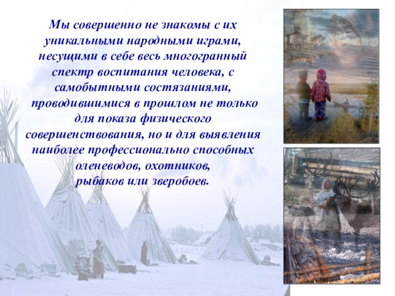 проводив­шимися в прошлом не только для показа физического совершенствования, но и для выявления наиболее профессионально способных оленеводов, охотников,