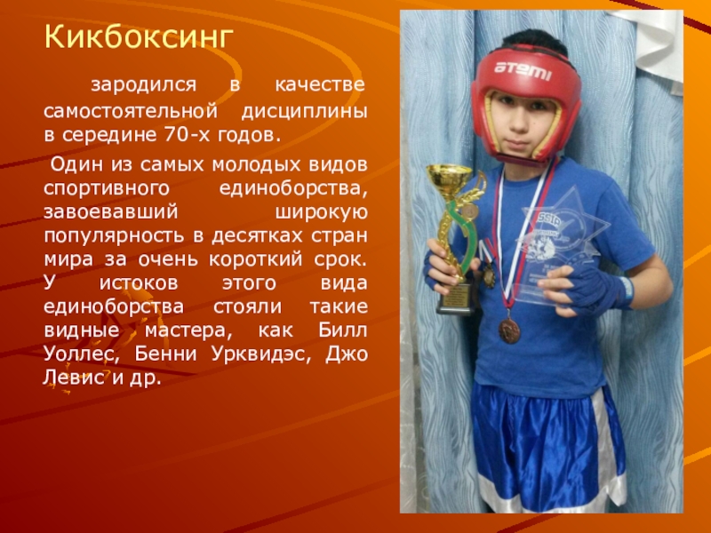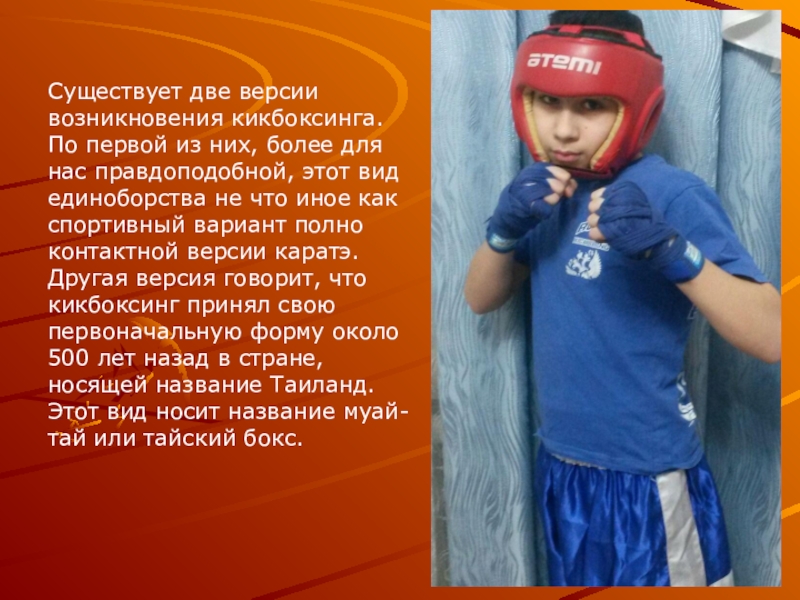 нас правдоподобной, этот вид единоборства не что иное как спортивный вариант полно контактной версии каратэ. Другая версия говорит, что кикбоксинг принял свою первоначальную форму около 500 лет назад в стране, носящей название Таиланд. Этот вид носит название муай-тай или тайский бокс.
