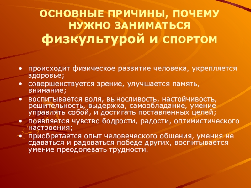 Слайд 5ОСНОВНЫЕ ПРИЧИНЫ, ПОЧЕМУ НУЖНО ЗАНИМАТЬСЯ физкультурой и СПОРТОМ