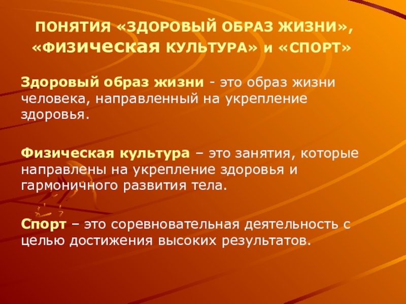 Слайд 4 ПОНЯТИЯ «ЗДОРОВЫЙ ОБРАЗ ЖИЗНИ», «ФИЗическая КУЛЬТУРА» и «СПОРТ»