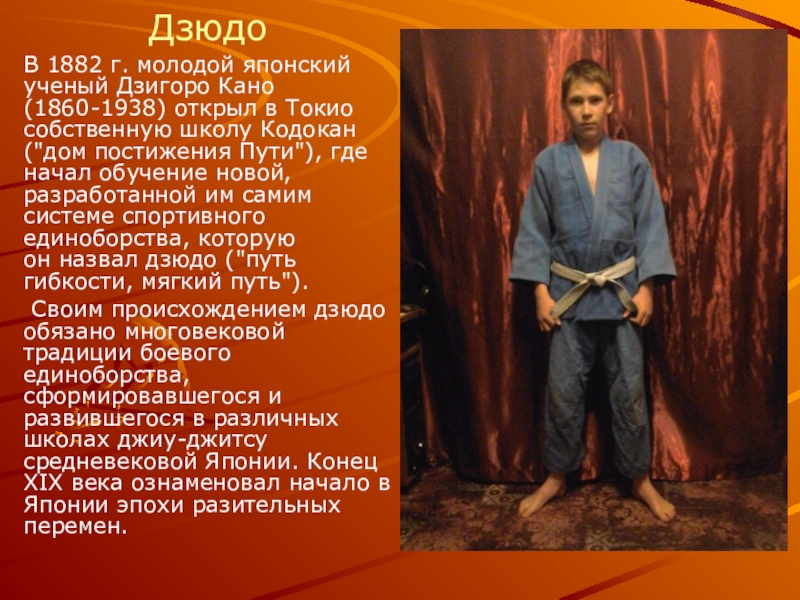 В 1882 г. молодой японский ученый Дзигоро Кано(1860-1938) открыл в Токио собственную