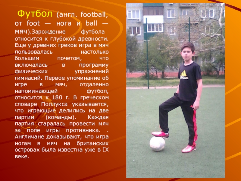 Слайд 21 Футбол (англ. football, от foot — нога и ball —
