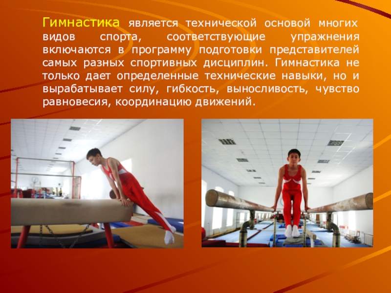 программу подготовки представителей самых разных спортивных дисциплин. Гимнастика не только дает определенные технические навыки, но и вырабатывает силу, гибкость, выносливость, чувство равновесия, координацию движений.