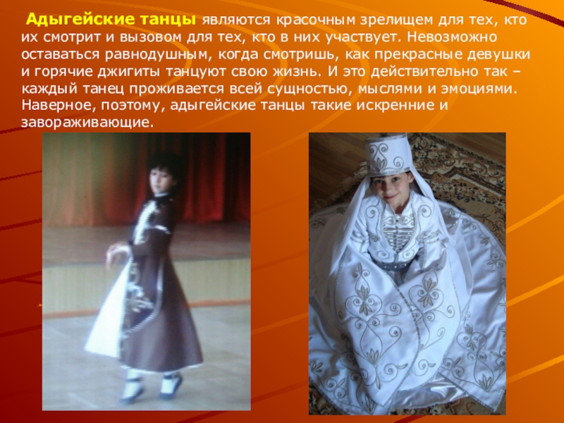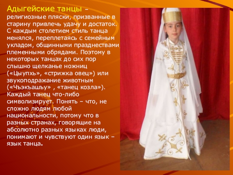 Слайд 25Адыгейские танцы – религиозные пляски, призванные в старину привлечь удачу и