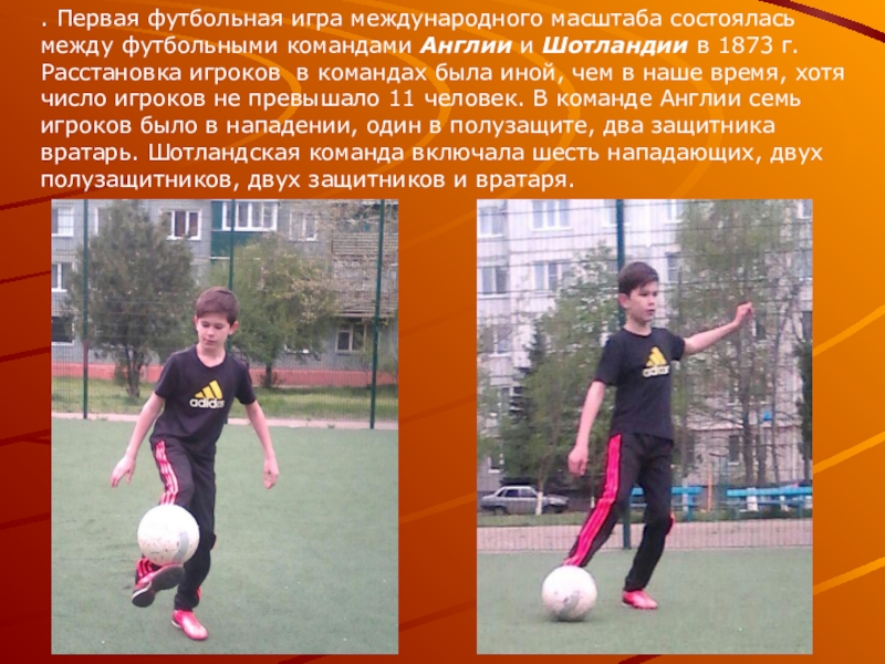 Слайд 22. Первая футбольная игра международного масштаба состоялась между футбольными командами Англии