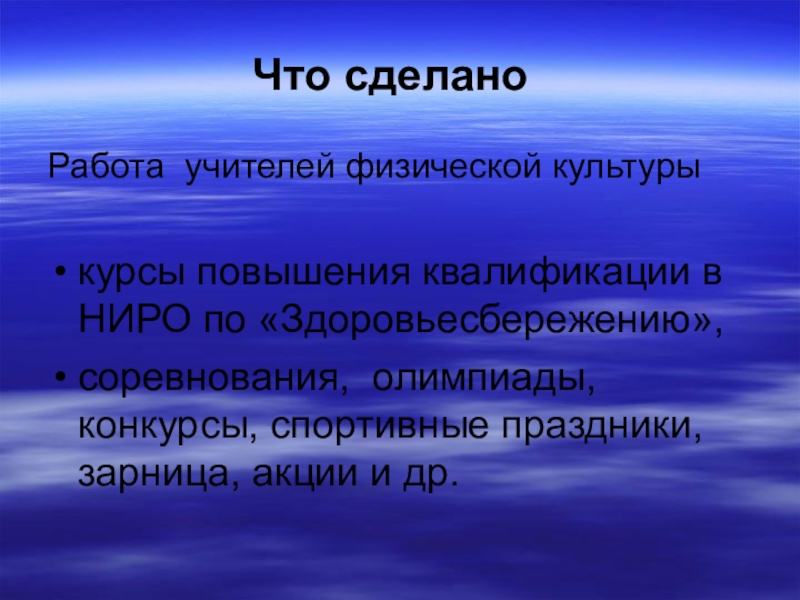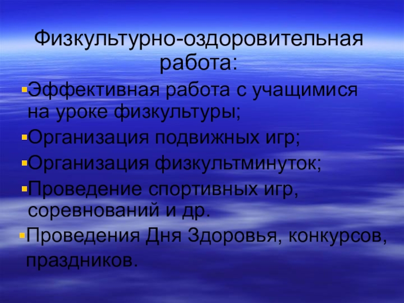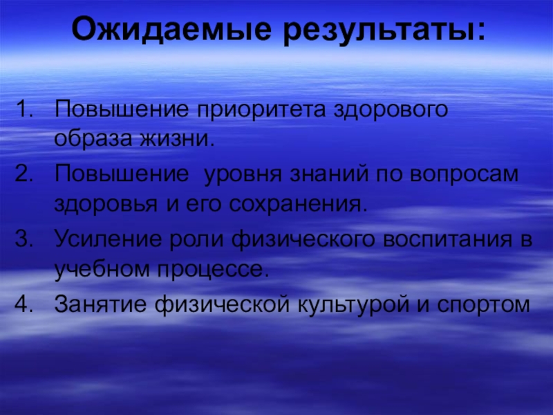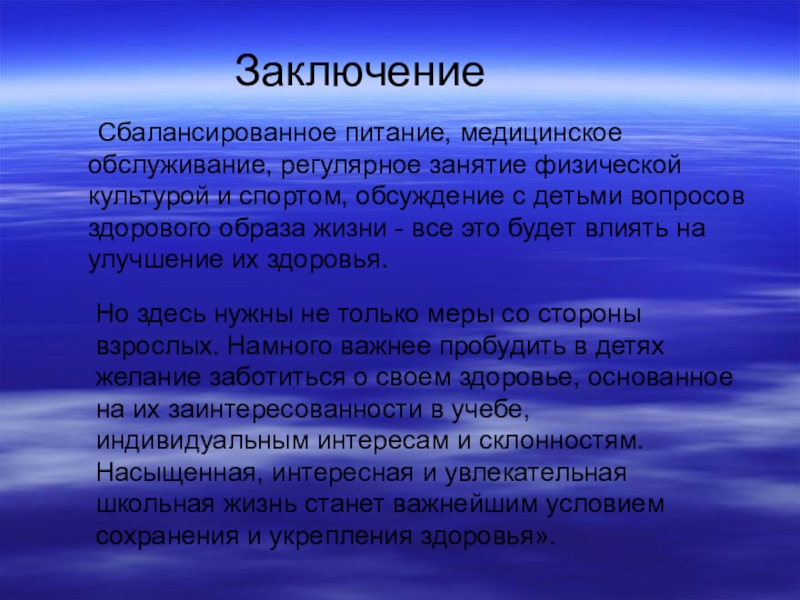 Но здесь нужны не только меры со стороны взрослых. Намного важнее пробудить в детях желание заботиться о своем здоровье, основанное на их заинтересованности в учебе, индивидуальным интересам и склонностям. Насыщенная, интересная и увлекательная школьная жизнь станет важнейшим условием сохранения и укрепления здоровья».