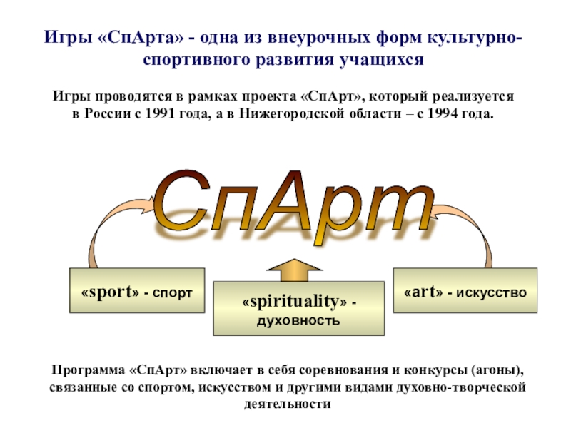 Игры проводятся в рамках проекта «СпАрт», который реализуется в России с 1991 года, а в Нижегородской области – с 1994 года.