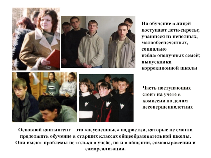 Основной контингент – это «неуспешные» подростки, которые не смогли продолжить обучение в старших классах общеобразовательной школы. Они имеют проблемы не только в учебе, но и в общении, самовыражении и самореализации.
