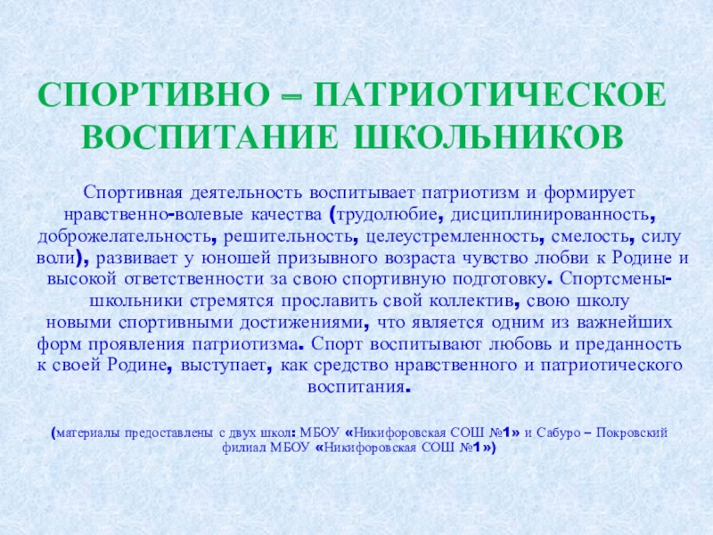 (трудолюбие, дисциплинированность, доброжелательность, решительность, целеустремленность, смелость, силу воли), развивает у юношей призывного возраста чувство любви к Родине и высокой ответственности за свою спортивную подготовку. Спортсмены-школьники стремятся прославить свой коллектив, свою школу новыми спортивными достижениями, что является одним из важнейших форм проявления патриотизма. Спорт воспитывают любовь и преданность к своей Родине, выступает, как средство нравственного и патриотического воспитания.