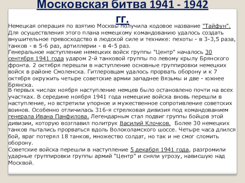 В первых числах ноября наступление немцев было остановлено почти на всех участках. В середине ноября 1941 года немецкие войска вновь перешли в наступление, но встретили упорное и мужественное сопротивление советских воинов. Особенно отличилась 316-я стрелковая дивизия под командованием генерала Ивана Панфилова. Легендарным стал подвиг группы бойцов этой дивизии, которую возглавил политрук Василий Клочков. Более 30 немецких танков пытались прорваться вдоль Волоколамского шоссе. Четыре часа длился бой, враг потерял 18 танков, множество солдат, но так и не смог сломить оборону.