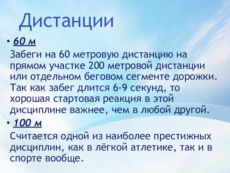 метровой дистанции или отдельном беговом сегменте дорожки. Так как забег длится 6-9 секунд, то хорошая стартовая реакция в этой дисциплине важнее, чем в любой другой.