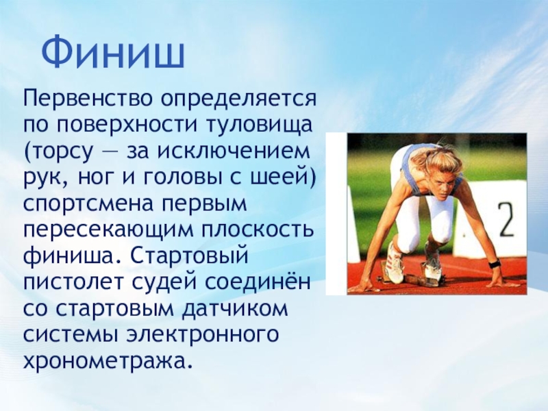 и головы с шеей) спортсмена первым пересекающим плоскость финиша. Стартовый пистолет судей соединён со стартовым датчиком системы электронного хронометража.