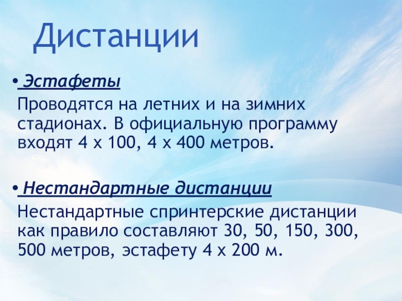 Нестандартные спринтерские дистанции как правило составляют 30, 50, 150, 300, 500 метров, эстафету 4 x 200 м.