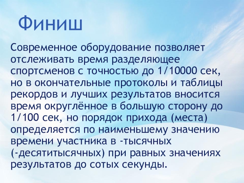сек, но в окончательные протоколы и таблицы рекордов и лучших результатов вносится время округлённое в большую сторону до 1/100 сек, но порядок прихода (места) определяется по наименьшему значению времени участника в -тысячных (-десятитысячных) при равных значениях результатов до сотых секунды.