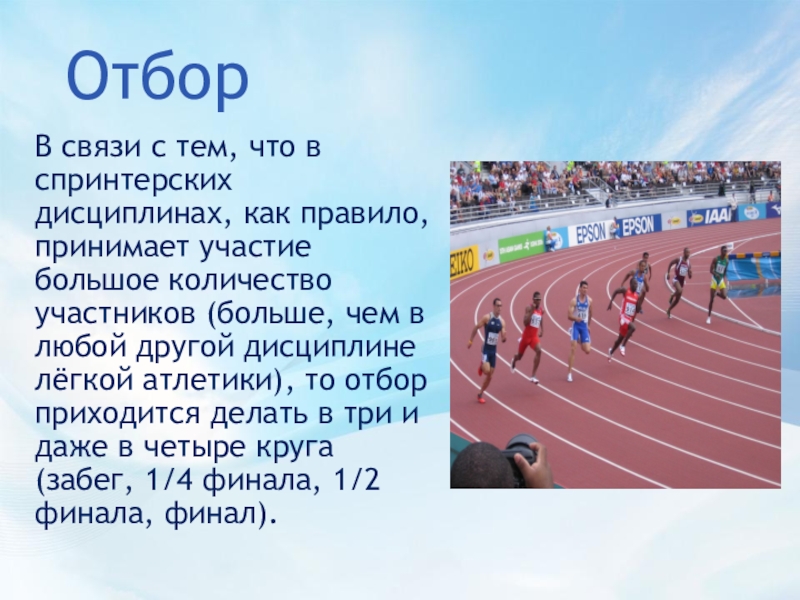 В связи с тем, что в спринтерских дисциплинах, как правило, принимает